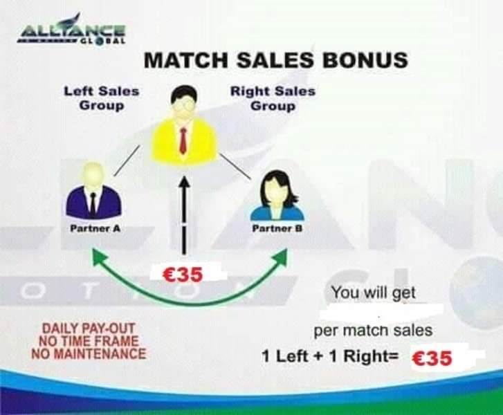 This is also known as the Binary System. Upon becoming a distributor, you will form two (2) groups under account, the Left Group and the Right Group. The Distributor immediately earns a Matched Sales Bonus of £35 for every 2,600 combined group points.YOUR MAXIMUM POTENTIAL INCOME IS £560/DAY OR 16 MATCHES PER DAY, GET £35 PER MATCHED.