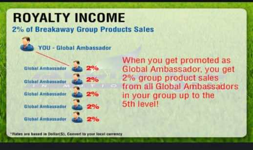 6. ROYALTY INCOME Once you get promoted as GA or Global AMBASSADOR, you get the 2% group products sales from all Global Ambassadors in your group up to the 5th level.