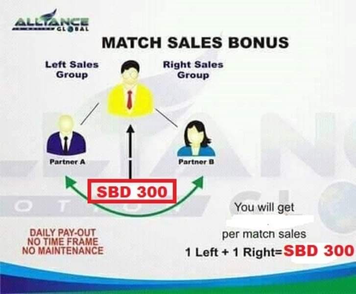 This is also known as the Binary System. Upon becoming a distributor, you will form two (2) groups under account, the Left Group and the Right Group. The Distributor immediately earns a Matched Sales Bonus of SBD 300 for every 2,400 combined group points.YOUR MAXIMUM POTENTIAL INCOME IS SBD 4,800/DAY OR 16 MATCHES PER DAY, GET SBD 300 PER MATCHED.
