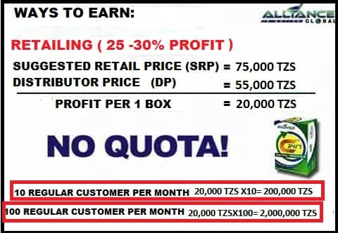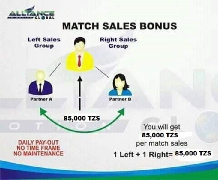 This is also known as the Binary System. Upon becoming a distributor, you will form two (2) groups under account, the Left Group and the Right Group. The Distributor immediately earns a Matched Sales Bonus of 85,000 TZS for every 2,800 combined group points.560 ZAR for every 2,800 combined group points.YOUR MAXIMUM POTENTIAL INCOME IS 1,360,000 TZS/DAY OR 16 MATCHES PER DAY, GET 85,000 TZS PER MATCHED.