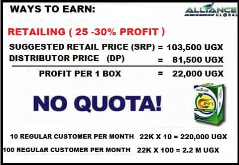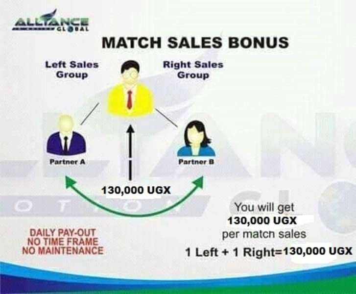 This is also known as the Binary System. Upon becoming a distributor, you will form two (2) groups under account, the Left Group and the Right Group. The Distributor immediately earns a Matched Sales Bonus of 130,000 UGX. for every 2,800 combined group points.YOUR MAXIMUM POTENTIAL INCOME IS 2,080,000 UGX/DAY OR 16 MATCHES PER DAY, GET 130,000 UGX PER MATCHED.